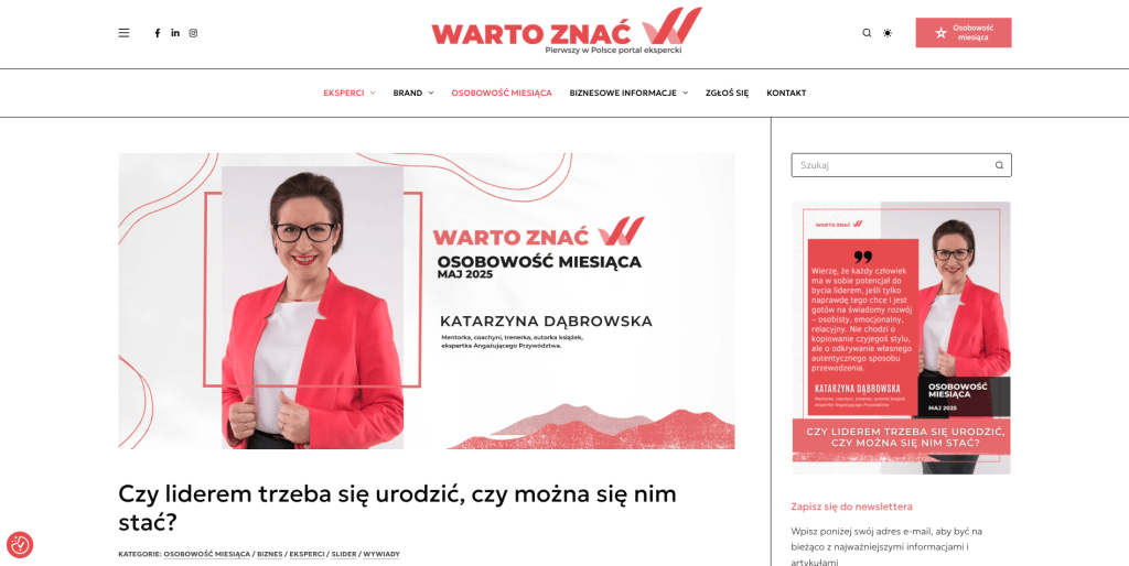 To jedno z tych pytań, które wciąż dzielą środowiska biznesowe, edukacyjne i społeczne. Tymczasem nasza rozmówczyni – Katarzyna Dąbrowska, mentorka, trenerka, liderka wspierająca rozwój innych liderów – z precyzją i empatią przełamuje ten podział. Pokazuje, że przywództwo nie jest zarezerwowane dla wybranych, obdarzonych „genem przewodzenia”, ale dostępne dla tych, którzy są gotowi na świadomą drogę.